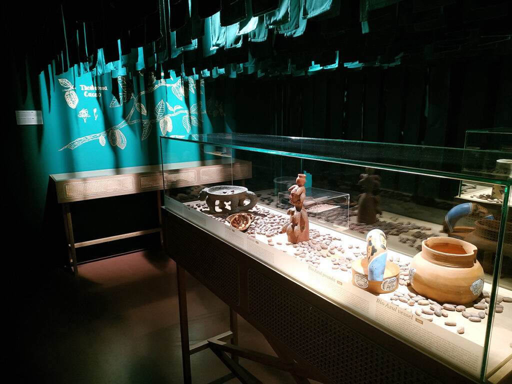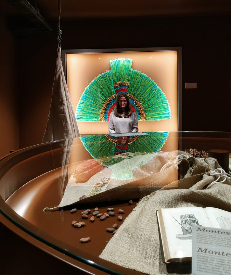 Zwiedzanie muzeum rozpoczyna się pośrodku pralasu, gdzieś w Środkowej Ameryce. To zdecydowanie moja ulubiona część wystawy – w pomieszczeniu panuje półmrok, a z sufitu zwisają długie, zielone płaty materiału udające bujną roślinność tropikalną. Tutaj dowiadujemy się m.in. jak ziarna kakaowca były wykorzystywane przez ludy indiańskie.